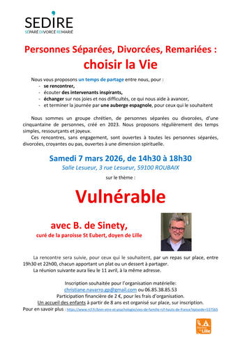 Depuis près de trois ans, un groupe de partage pour personnes séparées divorcées se réunit sur la métropole lilloise: apport d'intervenants, temps en petit groupe, en grand groupe, temps de prière, auberge espagnole, ...